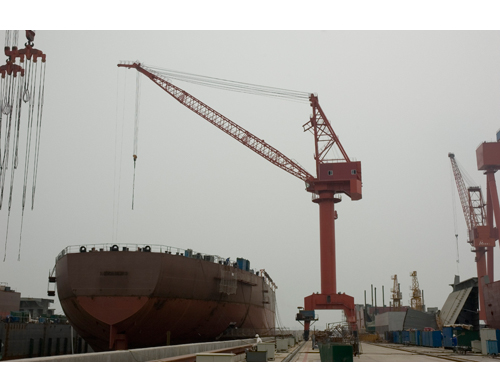 Kren limbungan kapal digunakan dalam proses pemasangan badan kapal di landasannya dan juga digunakan semasa membaiki kapal. Ia dilengkapi dengan dua troli pengangkat. Salah satu daripadanya mempunyai dua cangkuk utama yang bergerak di sepanjang landasan di atas perantara, dan satu lagi mempunyai satu cangkuk utama dan cangkuk kedua yang bergerak di sepanjang landasan di bawah perantara. Oleh itu, kren portal limbungan kapal boleh diterbalikkan untuk mengangkat badan kapal yang besar.
